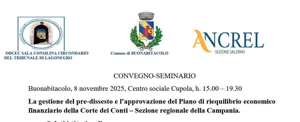 La partecipazione al seminario è gratuita, per i dottori commercialisti ed esperti contabili nonché per i revisori contabili iscritti al Registro Revisori e consentirà di acquisire n. 5 crediti formativi per ciascun incontro validi per l’iscrizione e/o mantenimento al registro revisori enti locali dietro superamento del test finale di 8 domande con il 75% delle risposte esatte argomenti trattati ( Min.Int.circ .F/L 7 del 05.04.2012) Per gli iscritti all’ODCEC saranno riconosciuti anche I crediti formative ordinari validi ai fini della FPC PRENOTAZIONE Commercialisti