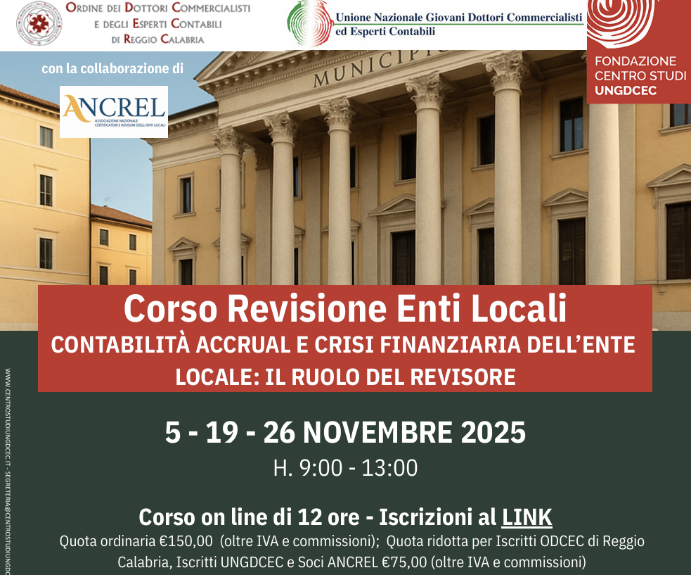 - Quota ridotta per Iscritti ODCEC di Reggio Calabria, Iscritti UNGDCEC e Soci ANCREL €75,00 (oltre IVA e commissioni)