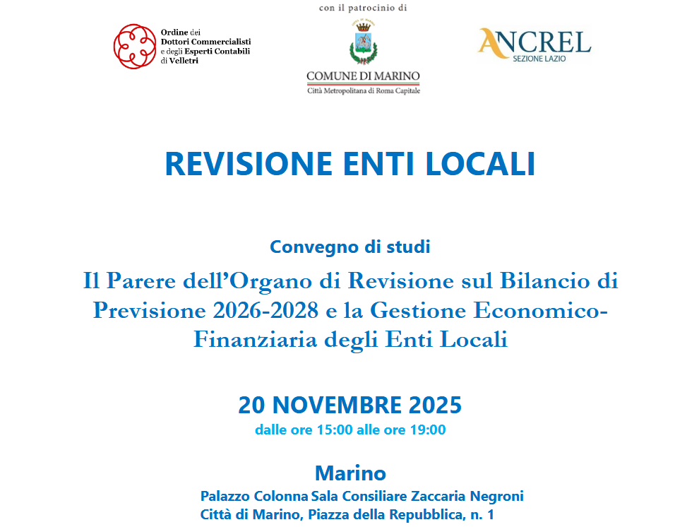 L’iniziativa, promossa dall’ODCEC di Velletri con il patrocinio del Comune di Marino, propone un approfondimento specialistico rivolto ai revisori degli enti locali, ai dirigenti economico-finanziari e agli operatori della contabilità pubblica.