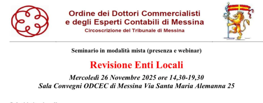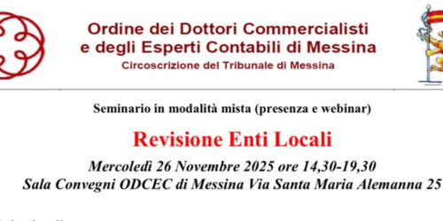 L’Ordine dei Dottori Commercialisti e degli Esperti Contabili di Messina organizza, in collaborazione con ANCREL – Sezione di Messina, il seminario in modalità mista (presenza e webinar) dedicato alla Revisione degli Enti Locali, in programma:
