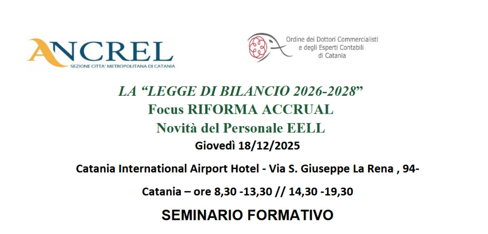 ANCREL Città Metropolitana di Catania organizza un seminario formativo dedicato all’analisi delle principali novità introdotte dalla Legge di Bilancio 2026–2028, con un focus specifico sulla Riforma Accrual e sugli aggiornamenti in materia di personale degli Enti Locali.