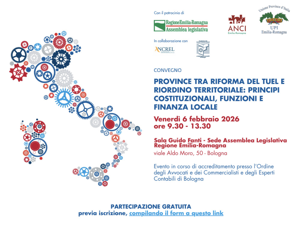 L’iniziativa, organizzata da UPI Emilia-Romagna con il patrocinio della Regione Emilia-Romagna e in collaborazione con ANCI e ANCREL, rappresenta un importante momento di approfondimento istituzionale e tecnico-giuridico.