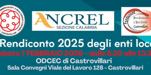ANCREL Sezione Calabria, in collaborazione con l’ODCEC di Castrovillari e la Fondazione ODCEC di Castrovillari, propone il convegno “Il Rendiconto 2025 degli enti locali”, un momento di aggiornamento qualificato dedicato ai temi chiave della gestione finanziaria e dei controlli negli enti locali.