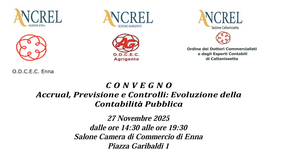 Il 27 novembre 2025, presso il Salone della Camera di Commercio di Enna, l’Ordine dei Dottori Commercialisti ed Esperti Contabili di Enna, in collaborazione con ANCREL, organizza il convegno “Accrual, Previsione e Controlli: Evoluzione della Contabilità Pubblica”.