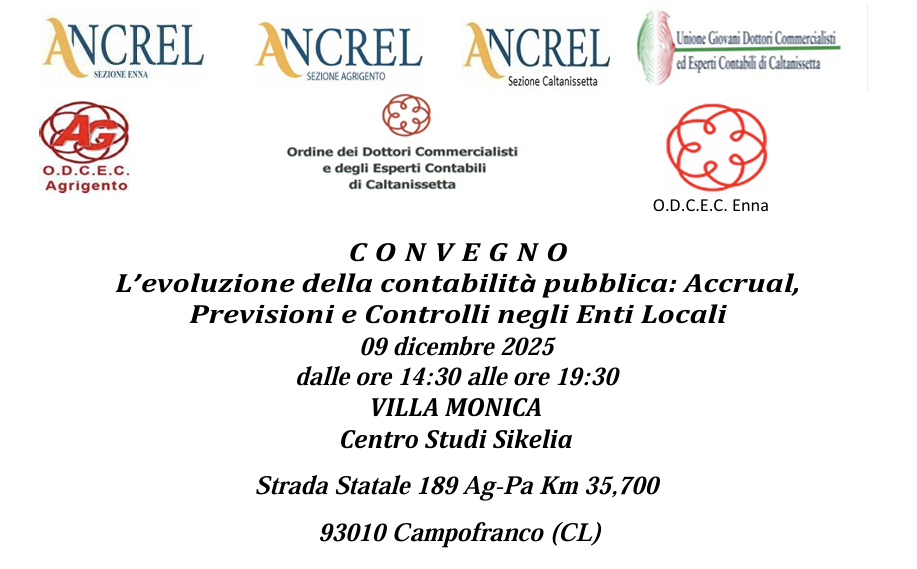 L’evento, promosso da ANCREL Caltanissetta, Ancrel Enna ed Ancrel Agrigento in collaborazione con O.D.C.E.C. e U.G.D.C. di Caltanissetta, e O.D.C.E.C.di Enna e Agrigento è rivolto a revisori, professionisti e operatori degli enti locali e mira ad approfondire le più recenti evoluzioni in tema di contabilità pubblica, con focus su programmazione, controlli e ruolo dell’organo di revisione