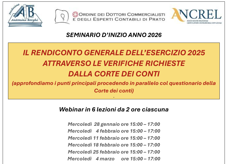Il seminario è organizzato da ANCREL, in collaborazione con Fondazione Antonino Borghi e ODCEC Prato, ed è rivolto a Revisori degli Enti Locali, Dottori Commercialisti ed Esperti Contabili.