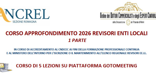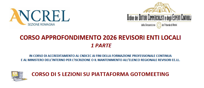 ANCREL Romagna organizza il Corso di approfondimento 2026 per Revisori degli Enti Locali – 1ª Parte, composto da 5 lezioni online sulla piattaforma GoToMeeting, in corso di accreditamento