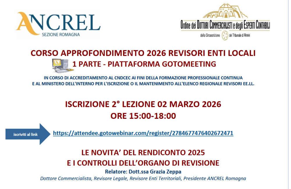 CORSO APPROFONDIMENTO 2026 REVISORI ENTI LOCALI: LE NOVITA’ DEL RENDICONTO 2025 E I CONTROLLI DELL’ORGANO DI REVISIONE